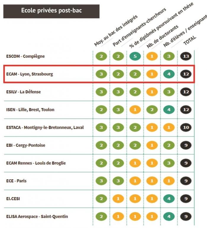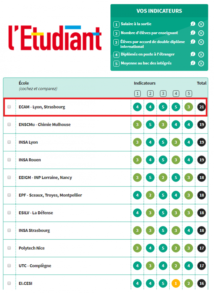 Insertion professionnelle, accompagnement des élèves, international : ECAM Lyon, Strasbourg obtient la 1èreplace  du classement des écoles d'ingénieur post-bac (sur 75 établissements) sur les critères en droite ligne avec les valeurs et le projet pédagogique de l’Ecole :