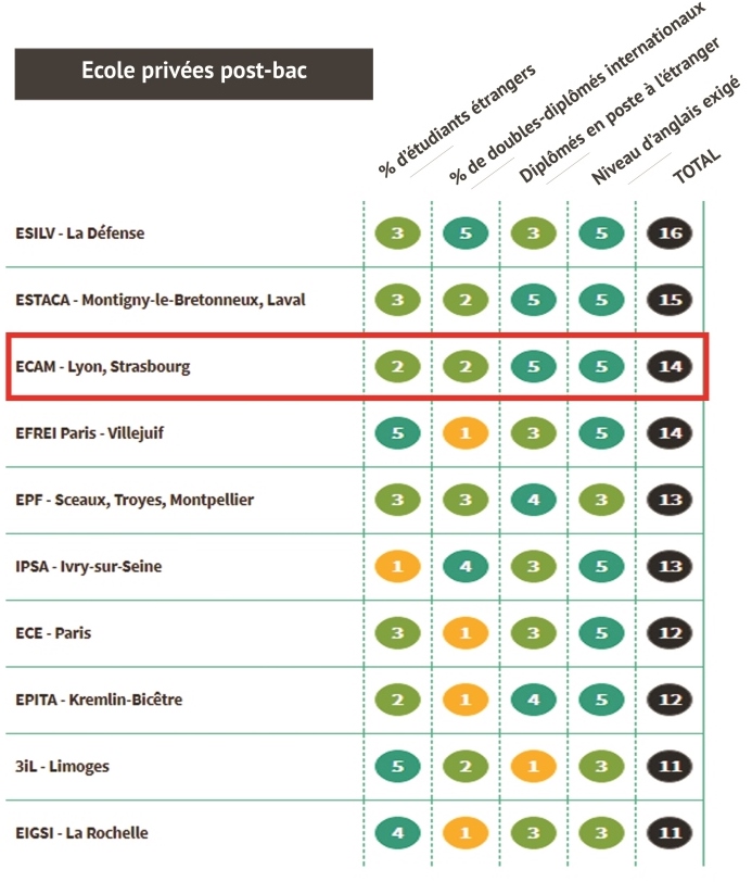 ECAM Lyon, Strasbourg obtient la 3ème place des écoles d'ingénieurs privées post-bac, sur 30 établissements dans la catégorie "Ouverture Internationale". Elle apparaît également dans le TOP 10 des écoles d'ingénieurs de France pour côtoyer des étudiants internationaux. Ce classement s'appuie sur plusieurs critères :